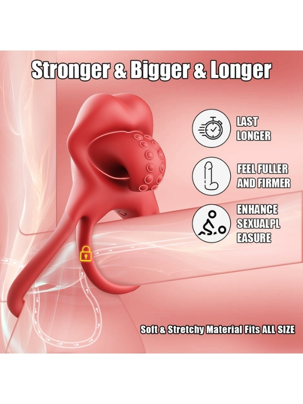 Kırmızı Dil Kilidi Penis Halkası, güçlü titreşim motoru ve ergonomik tasarımıyla hem zevki artırır hem de erken boşalmayı geciktirmeye yardımcı olur. Esnek silikon halkası penisi sıkıca sararak kan akışını dengeler, uzun süren sertlik ve dayanıklılık sağlar.